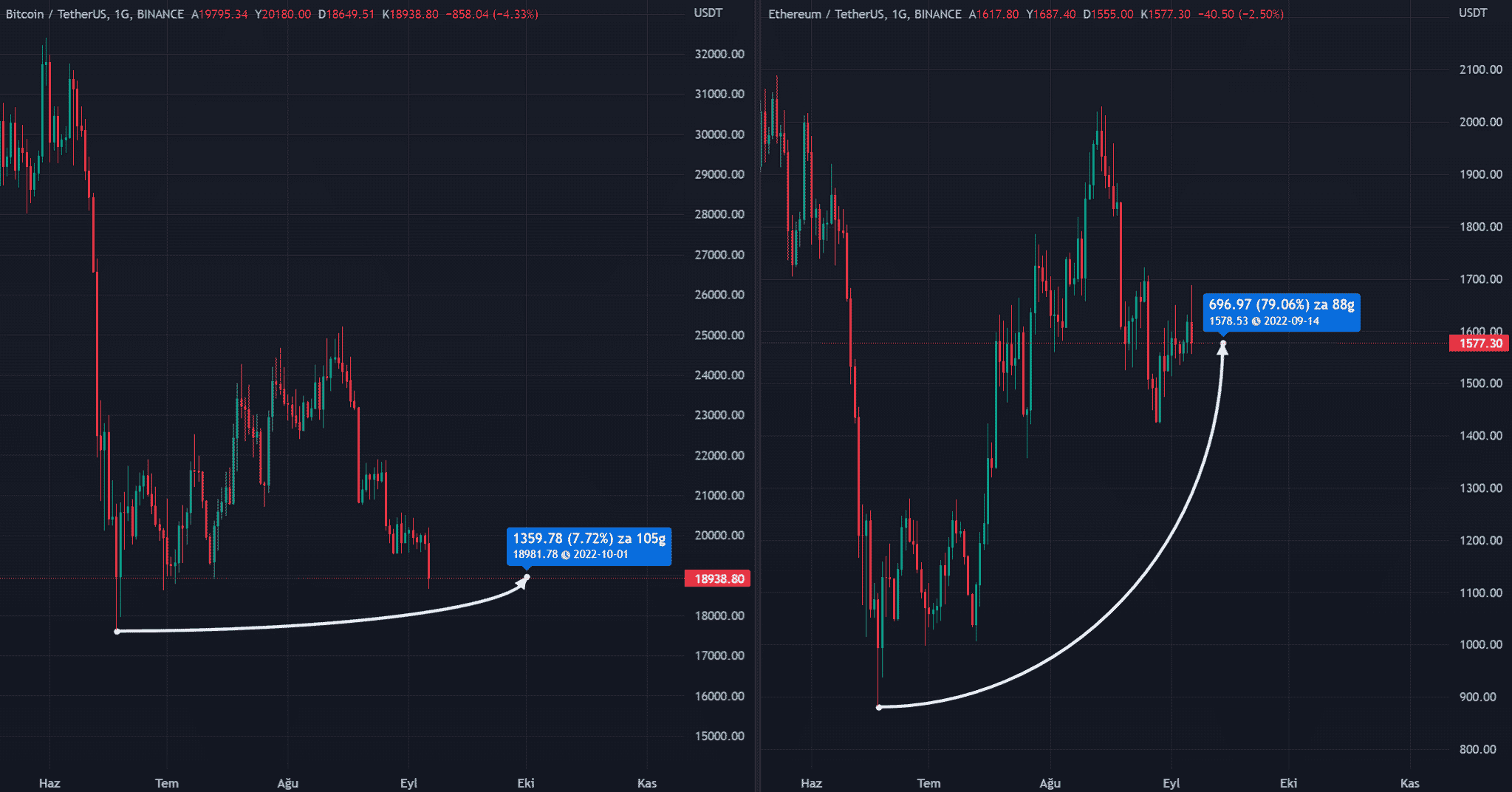 2022 yılı özelinde grafiğe bakacak olursak Bitcoin fiyatı 2022 yılındaki en düşük seviyesinin +%8 yukarısındayken, Ethereum fiyatı 2022 yılının en düşük seviyesinden +%80 yukarıda bulunmakta.