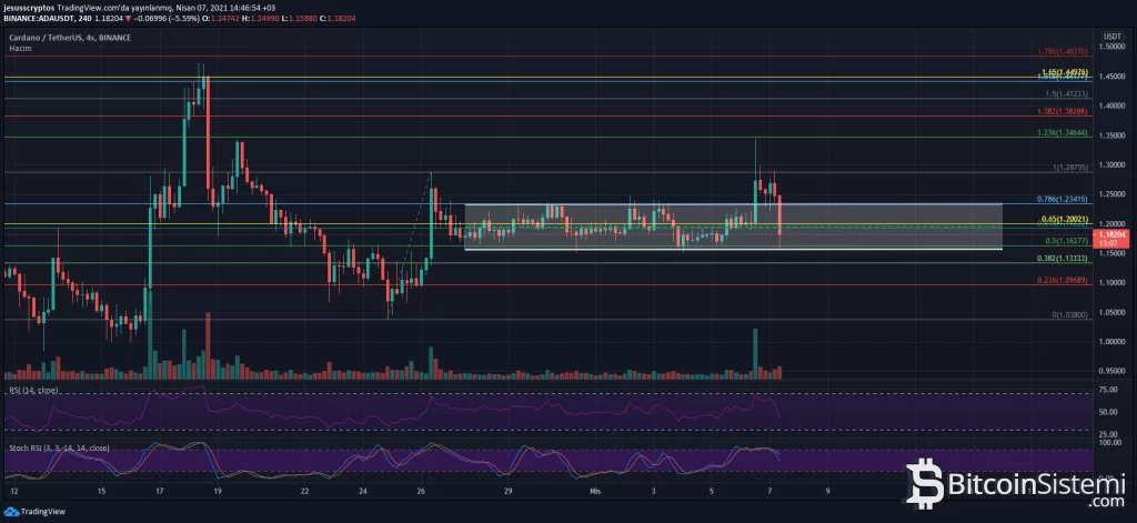 Günlük grafiğin yanı sıra 4 saatlikte fiyatın iki defa satış yediği 1.44 – 1.45 dolar aralığı önemli bir direnç alanı olarak görülüyor. Bu alanın dışında dün fibonacci 1.236 seviyesi olan 1.346 dolardan reddedilen ADA, daha önce konsolide olduğu 1.16 – 1.234 dolar aralığına geri dönüyor.