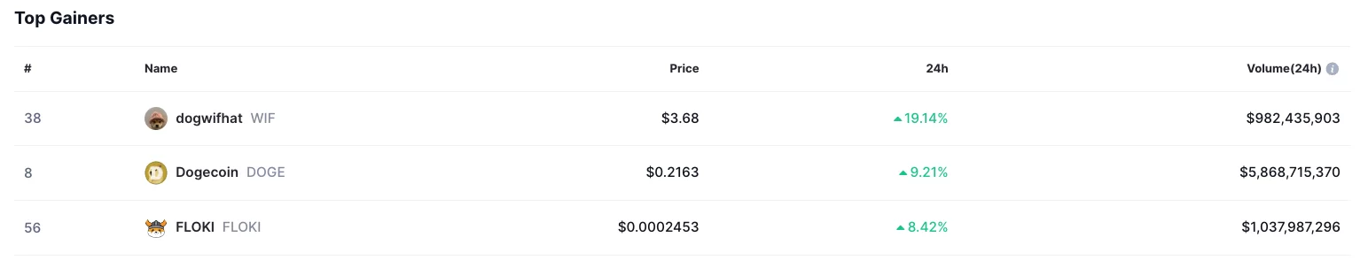 WIF bu artışla en çok kazandıran altcoinler listesinde zirveye otururken WIF’ı Dogecoin (DOGE) ve Floki Inu (FLOKI) takip etti.