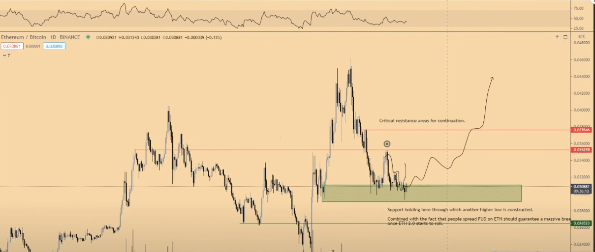 BTC paritesinde sıralı dirençleri 0.0353 ve 0.03760 satoshi olarak belirten analist bu bölgelerin aşılması durumunda Ethereum’daki yükselişin hızlanacağını düşünüyor.