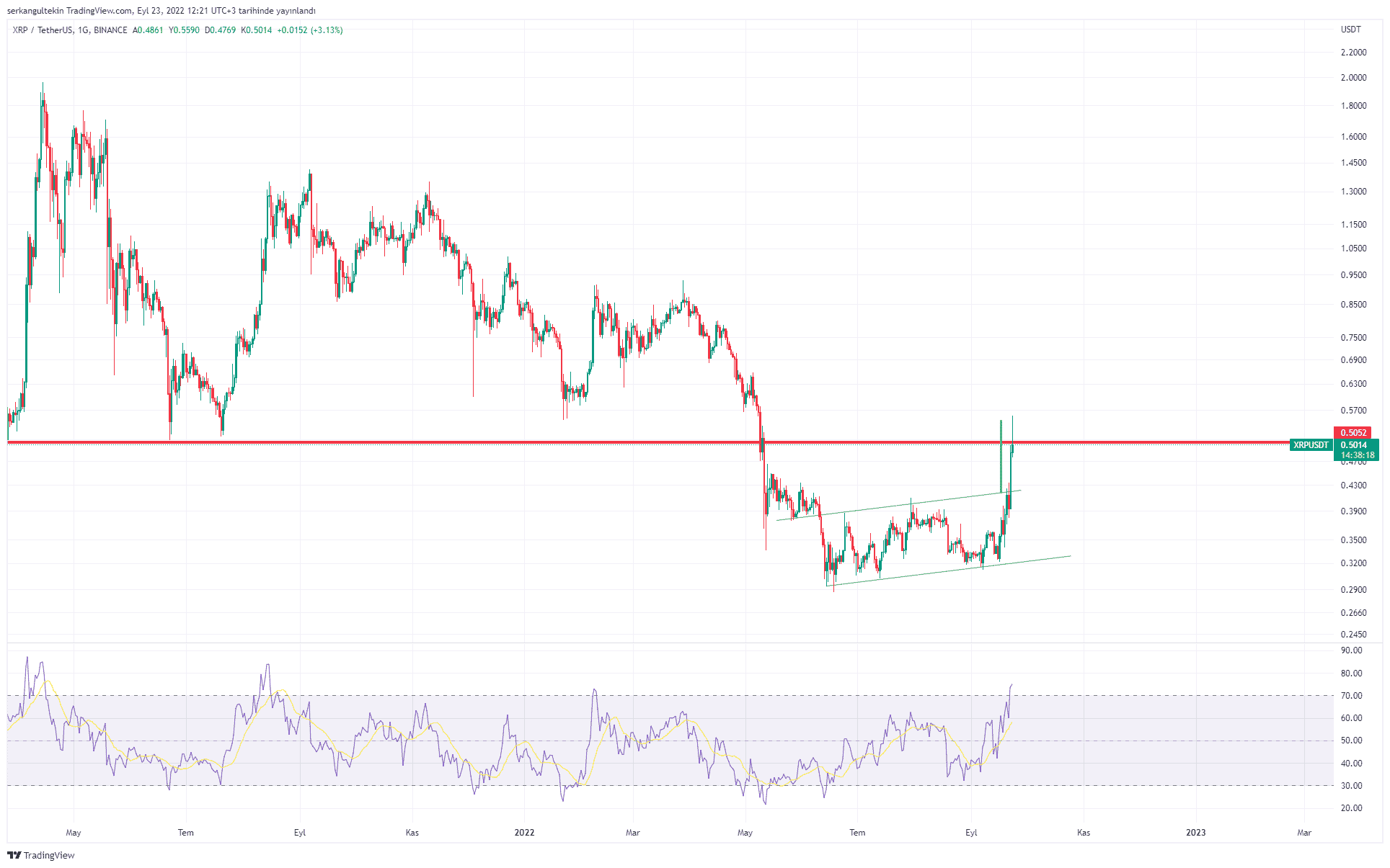 Ripple şu anda önemli bir direnç noktasında bir haber desteği olmadan 0,50$ seviyesinin tek seferde kırılması ve üzerindeki kalıcılık kolay olmayacaktır. Bu nedenle yeni giriş yapmak isteyenlerin dikkatli olmasında fayda var. Günlükte oluşan ters çekiçte oldukça kötü görünüyor.