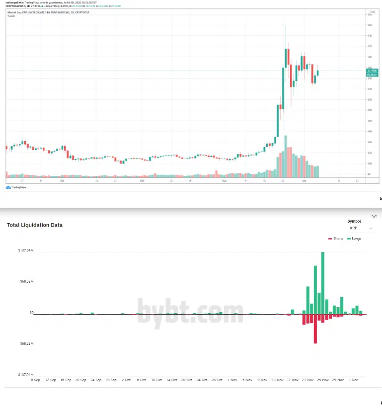 XRP’de özellikle volümün çok düşük olduğu 17 Kasım’a kadar olan süreçte likit mumları çok küçükken (tablo oransal mum boyu veriyor), 0,70 dolarlık seviyeler görüldükten sonra artan ilgi ve hacimle, volatilite kullanılarak orantısız likit olma seviyelerinin ortaya çıktığı gözlemleniyor.