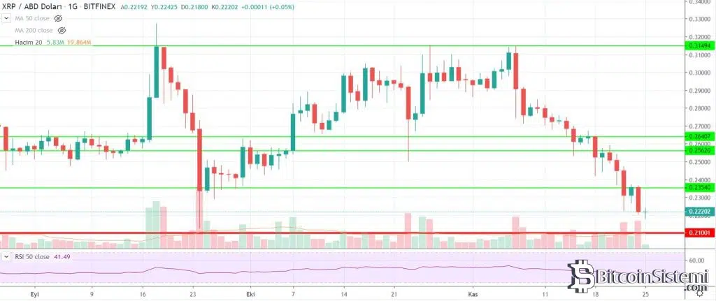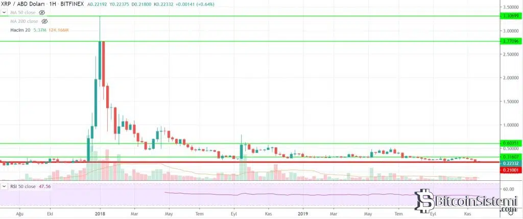 Son yılların en düşük fiyat seviyelerinde işlem gören XRP, 0,215 dolar desteğinde tutunmaya çalışıyor. Uzmanlara göre bu fiyat seviyesinin altına sarkılırsa rekor seviyede düşüşler görülebilir.