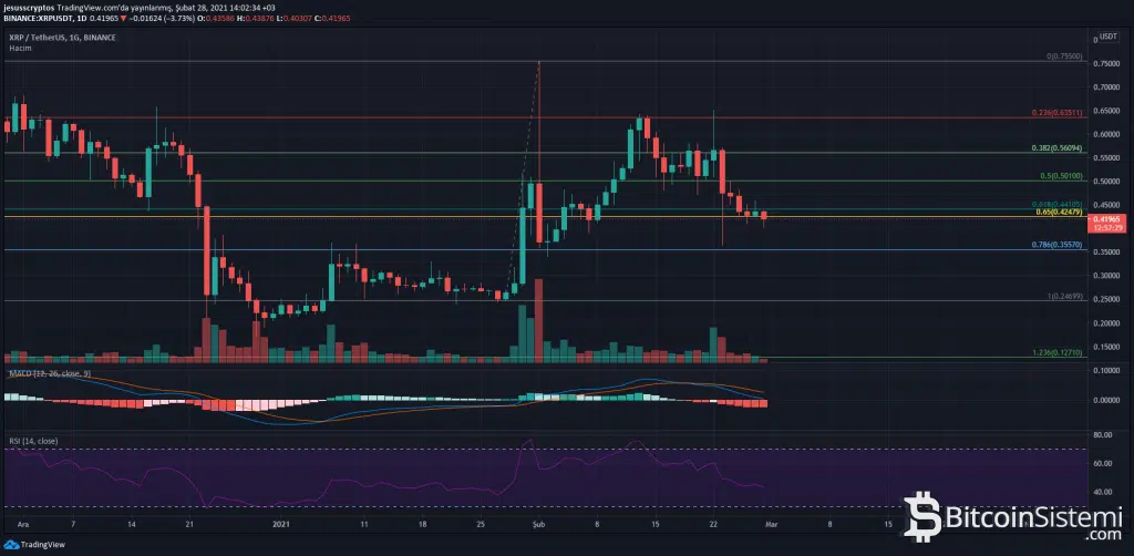 Günlük grafikte uygulanan Fibonacci Düzeltmesine göre XRP, son üç gündür 0.424 – 0.441 dolar aralığında fiyatlanıyor. Bu gece gerçekleşecek olan hafta kapanışını bu alan üzerinde geçirmesi ya da en azından 0.40 dolar üzerinde olması XRP için önem arz ediyor.