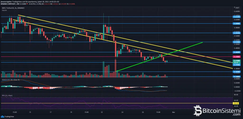 Ayrıca düşüş trendi çizgisi olan sarı trend çizgileri ve daha önce birkaç defa destek olan yeşil trend çizgisi, fiyatın önünde artık bir direnç niteliği taşıyor. Her şeye rağmen XRP bu dirençleri geçebilirse, yatayda bulunan 0.46 dolar üzerinde 0.51 dolara kadar bir sıçrama görülebilir.