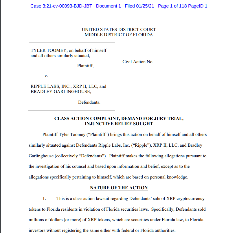 Toomey ve diğerleri, XRP’nin Florida Menkul Kıymetler ve Yatırımcı Koruma Yasası’nı ihlal ettiği iddia ederek Ripple’a karşı 25 Ocakta toplu dava açtı.
