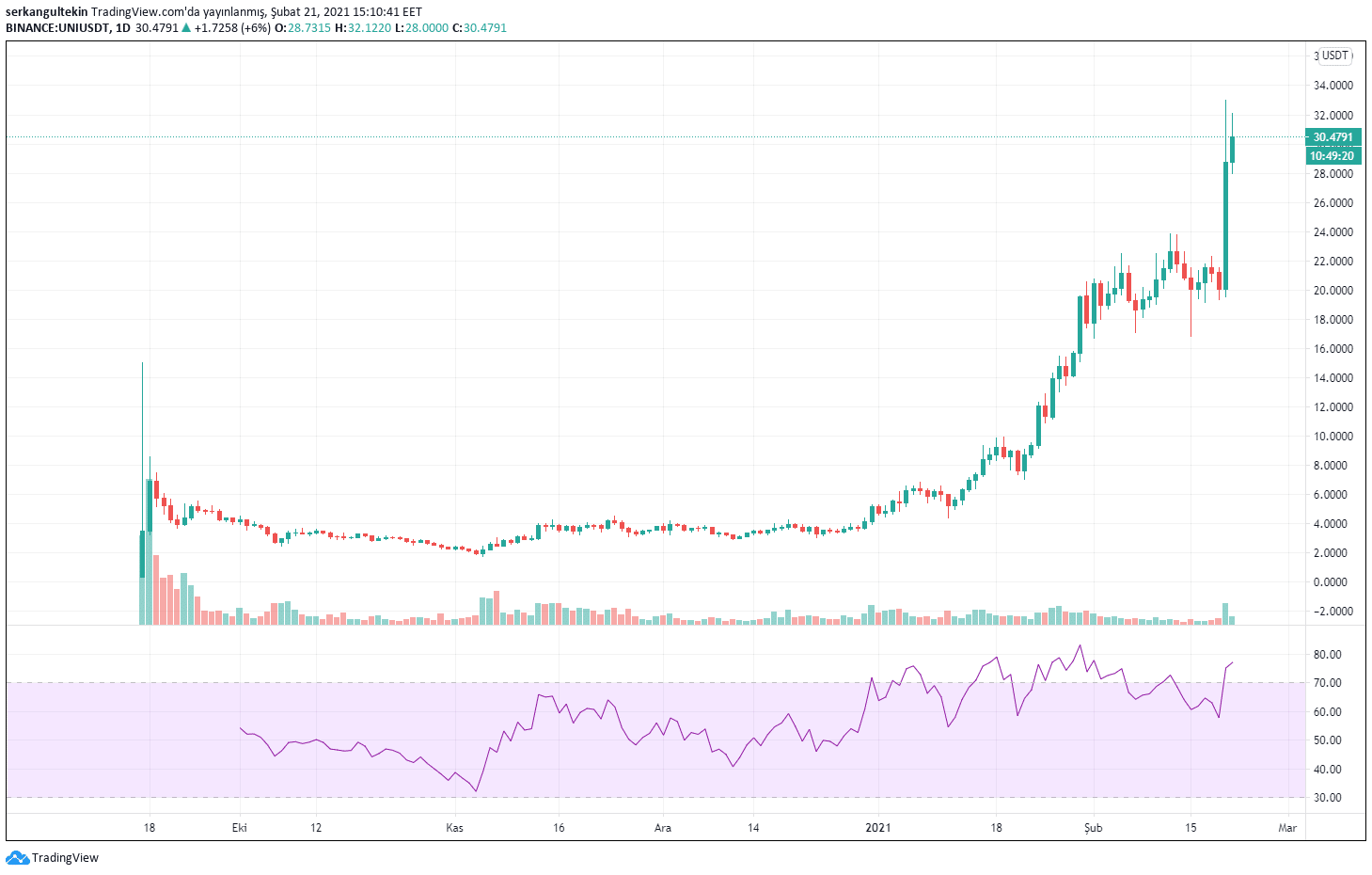 Bitcoin ve altcoinlerde yaşanan bir büyük fiyat patlamaları merkeziyetsiz borsalar tarafında da yaşandı. Bunların başında da Uniswap geliyor. UNI yatırımcıları için 2021 yılı iyi geçiriyor.