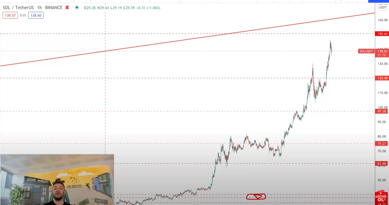 Solana hakkında da konuşan analist 150$ seviyesinin direnç bölgesi olduğunu, yeni giriş için 120$ seviyelerinin değerlendirilebileceğini, 120$ altı 4 saatlik kapanışlarla parabolik yükselişin son bulacağını ifade etti.