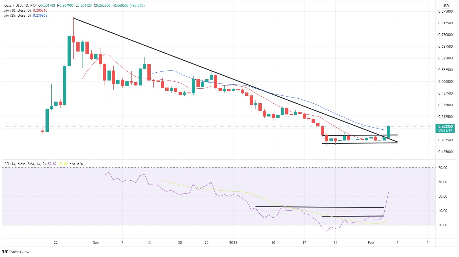 Analistlere göre bugün gelen yükseliş ile birlikte GALA fiyatı, 21 Ocak tarihinden bu yana savunulan 0.2115 dolar seviyesini de aşmış oldu.