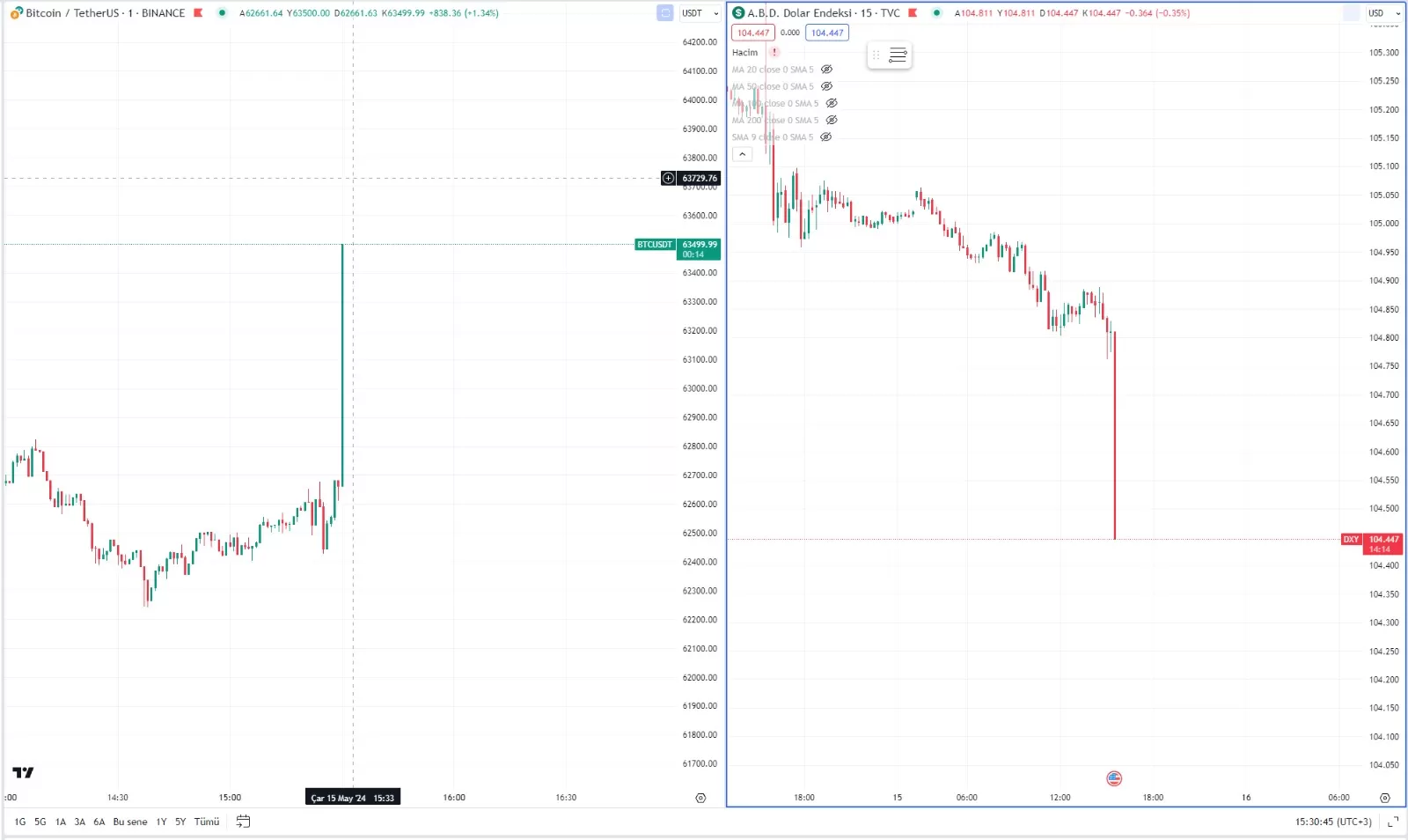 Açıklanan veriler sonrası Bitcoin ve Doların (DXY) ilk tepkisi şu şekilde gerçekleşti.