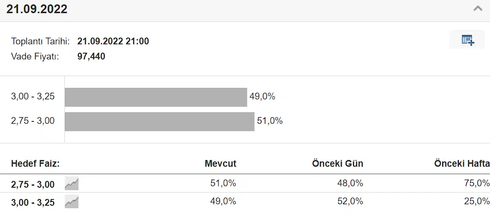 Enflasyonun açıklamasıyla beraber bir sonraki FED toplantısında 50 baz puanlık artış ihtimali yüzde 42 olurken 75 baz puanlık artış ihtimali yüzde 58 oldu.