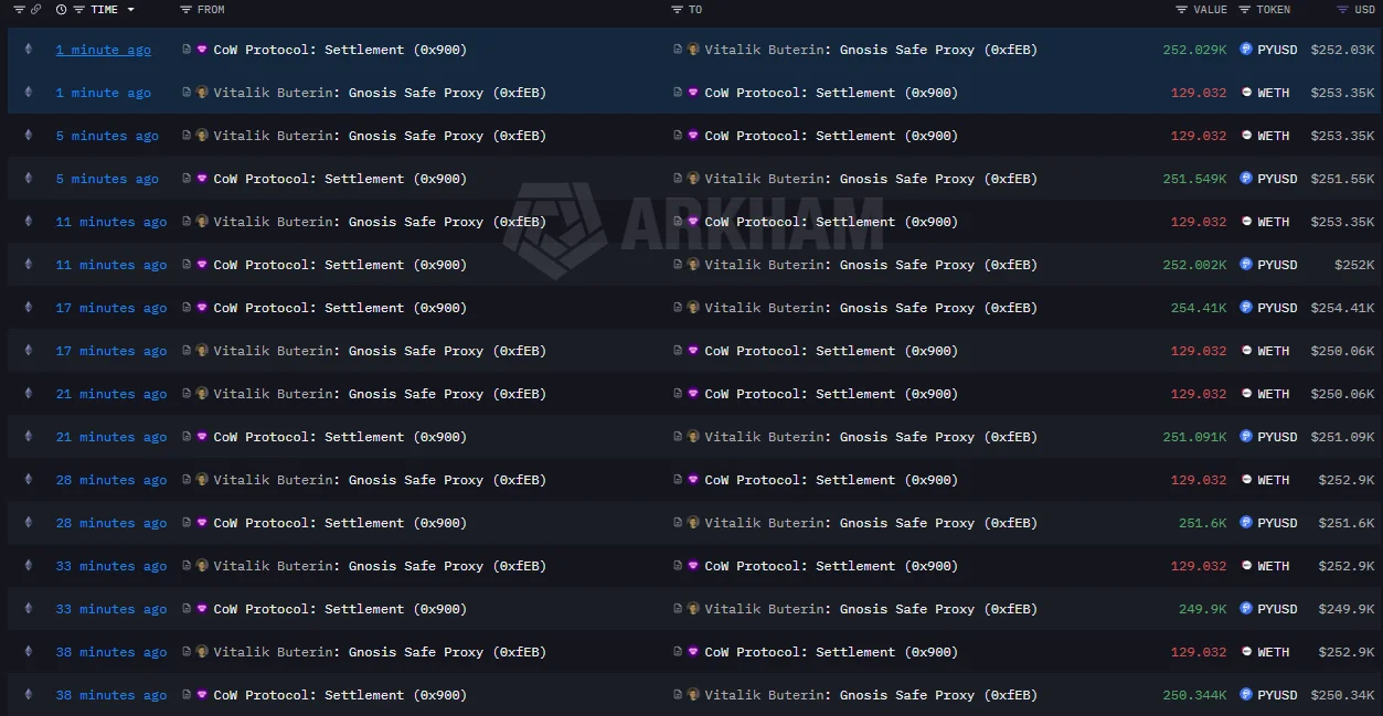 Vitalik Buterin’in WETH’leri Cow Protocol’e gönderip karşılığında PYUSD stablecoini çektiği görülüyor. Satışların büyüklüğünün son 1 saat içerisinde 2.5 milyon dolara ulaştığı bildiriliyor. Bununla birlikte Buterin, gün içerisinde belirli aralıklar çok sayıda satış yaptı.