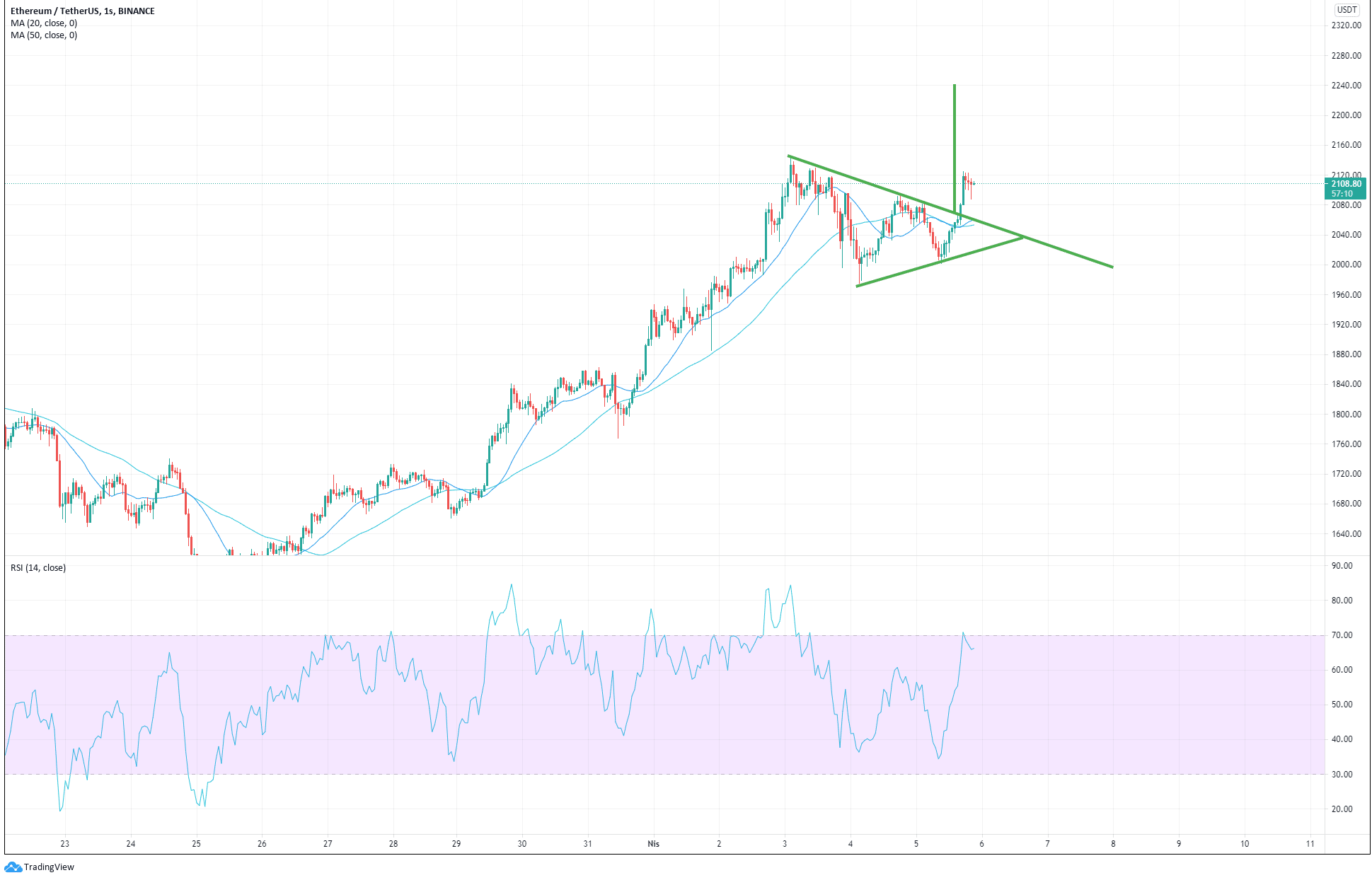 Marketteki pozitif hava ile birlikte risk iştahının yükselmesi Ethereum’un da kısa süreli düşen trendini kırmasını sağladı. Ethereum’da yukarıya kırılan simetrik üçgenin hedefi 2240$ olarak görülüyor. 2065$ seviyesindeki kırılan trend desteği altına stop olmak koşuluyla takip edilebilir.