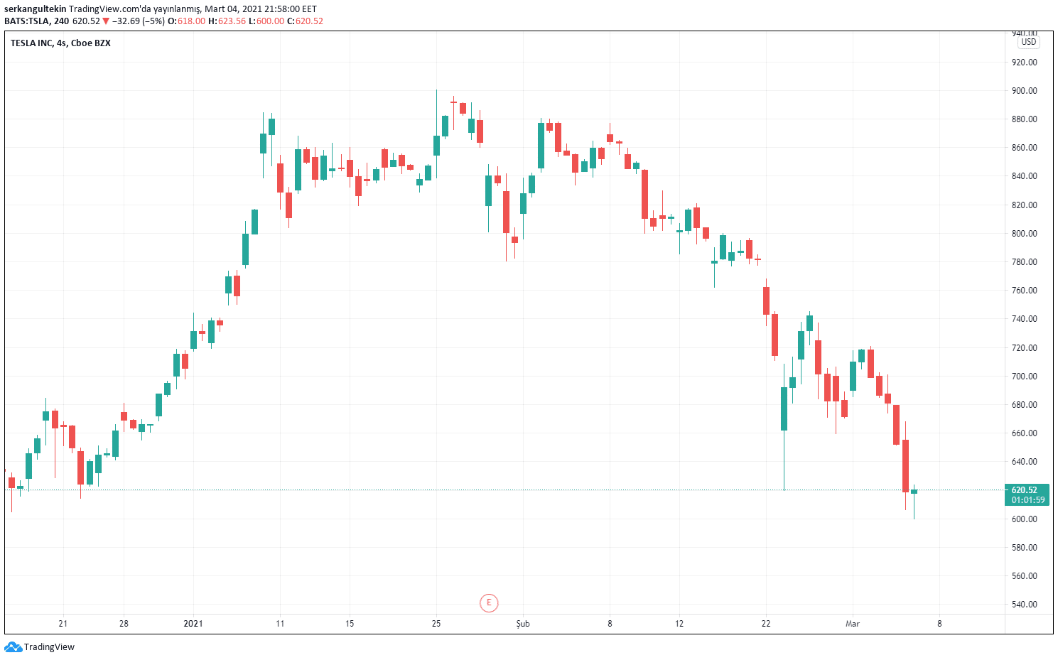 Bitcoin yatırımlarıyla gündeme gelen Tesla, bugün %10 oranında değer kaybederek 600$ seviyesine kadar geri çekildi.