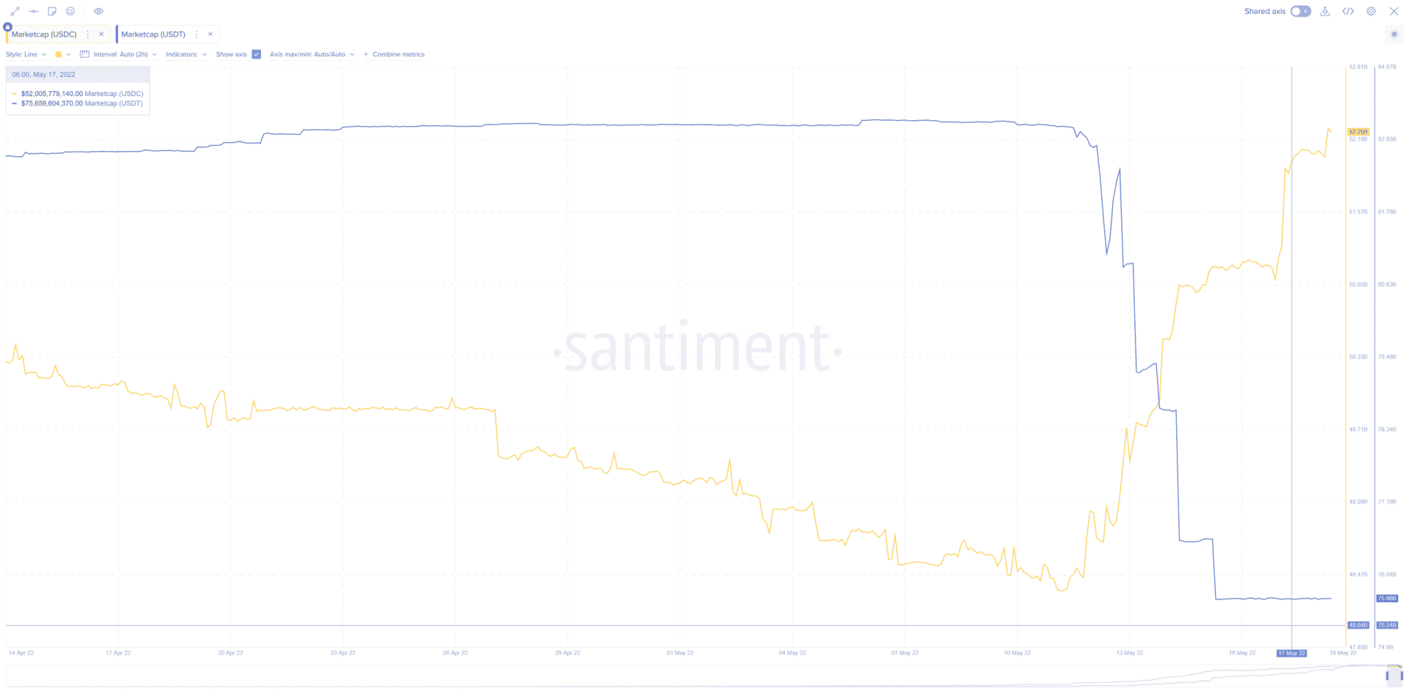 USDC’nin piyasa değeri 11 Mayıs’tan bu yana %10’dan fazla bir artışla 48 milyar dolardan 53 milyar dolara fırladı. Diğer stabilcoin’lerdeki düşüş Circle’ın son iki haftada 10 milyardan fazla coin basmasına yol açtı.