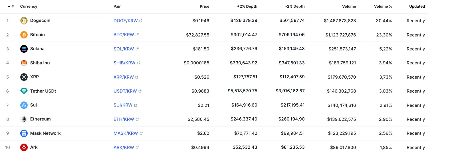 Bitcoin, 1,12 trilyon KRW’lik işlem hacmiyle ikinci sırada yer alırken, DOGE ve BTC’yi Solana (SOL), Shiba Inu (SHIB) ve XRP takip etti.
