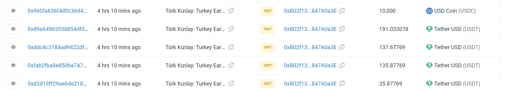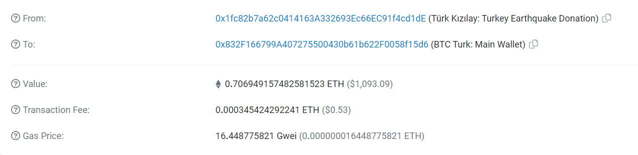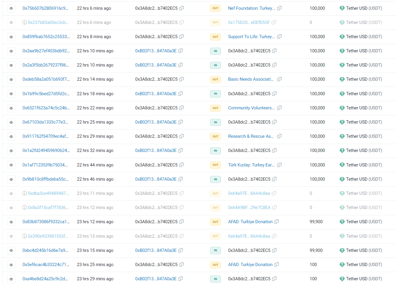 Türk Kızılay’ına 100.000$’lık bağış yapan bir cüzdanın aynı miktarda bağışı 7 farklı kuruma gönderdiği ve toplamda 700.000$’lık bağış yaptığı görüldü.