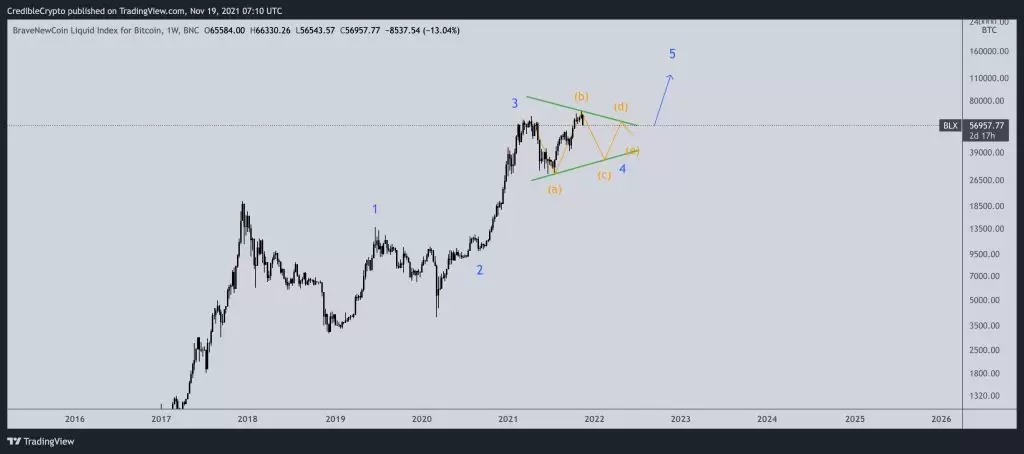 Elliott Dalga teorisini baz alan analiste göre Bitcoin’in dördüncü dalgası -BTC’nin son büyük ayağından önceki son düzeltici hamle- büyük bir simetrik üçgen şeklinde olabilir.