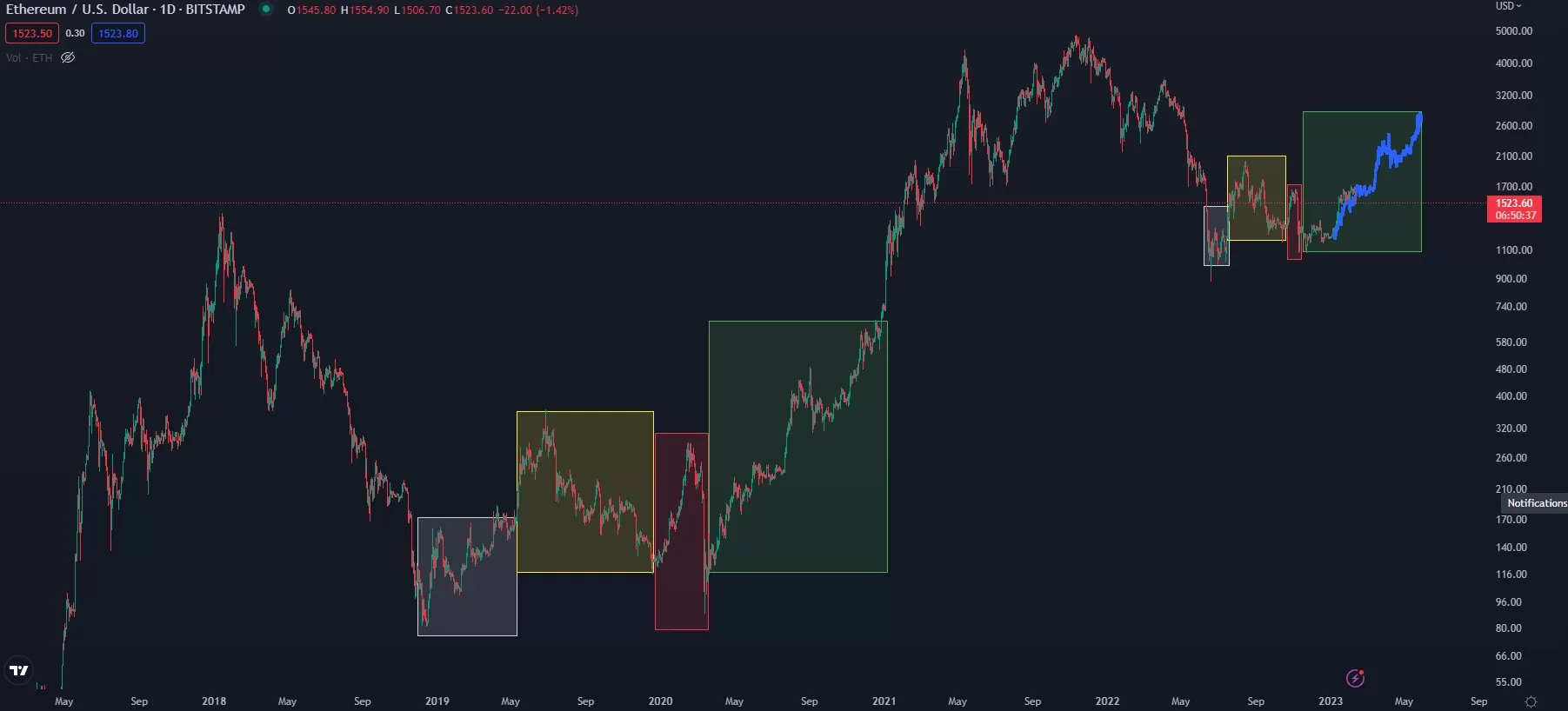 Kaleo’nun paylaştığı grafiğe göre Ethereum için benzer bir fiyat hareketi gerçekleşirse ETH fiyatı yılın 3. çeyreğinde 3.000$’a yükselecek. Analistin hedefinin gerçekleşmesi, Ethereum’un bugünden itibaren %100’den fazla değer kazanması anlamına geliyor.