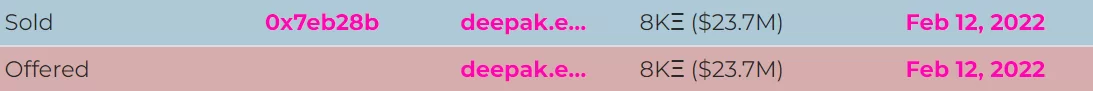 21 Şubat 2021 tarihinde herhangi bir ücret ödenmeden başka bir hesaba transfer edilen NFT, bunun ardından 12 Şubat 2022 tarihinde bu kez 23.7 milyon dolar ödenerek el değiştirmiş oldu.