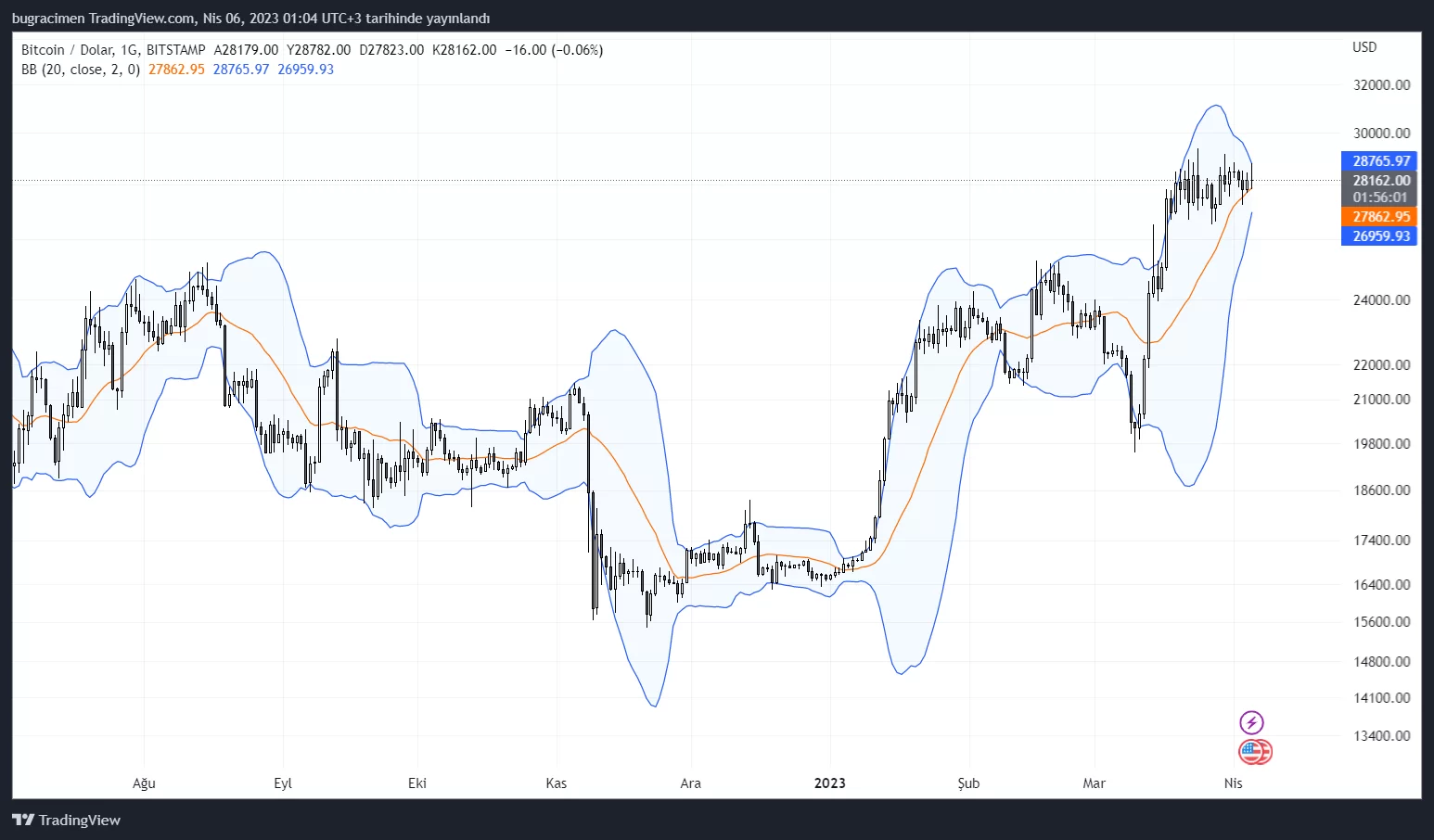 Bollinger Bantları indikatörünü incelediğimizde kriz esnasında büyük bir genişleme görüyoruz. Ancak Bitcoin’in yaklaşık 20 gündür yerinde sayması nedeniyle bant oldukça daraldı. Bunun sonucunda yukarı veya aşağı yönlü sert bir kırılım olması bekleniyor.