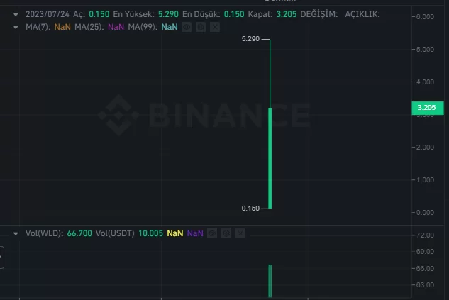 TSİ 12.00’da Binance’te listelenen WLD 0,15$’dan açıldıktan sonra 5,29$’a kadar yükseldi. WLD şu anda 3,3$ seviyesinden işlem görüyor.