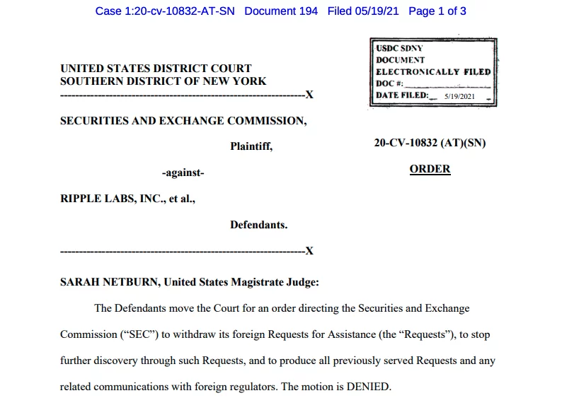 Ripple, SEC’nin yabancı regülatörler ve borsalarla iletişime geçerek XRP ve Ripple hakkında bilgi topladığını ortaya koymuştu. Ripple, buna şiddetle karşı çıkarak SEC’nin söz konusu eylemlerini bitirmesini talep etti ve mahkemeye dilekçe verdi. Netburn ise Ripple’ın bu dilekçesini reddederek, SEC’nin söz konusu araştırmalarına devam edebileceğine hükmetti.