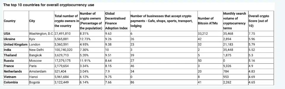 Finbold tarafından paylaşılan verilere göre kripto para kullanımı en yaygın ( yatırım ve ödemeler dahil) ülke ABD olurken, onu halen Rus işgali altında bulunan Ukrayna takip etti.