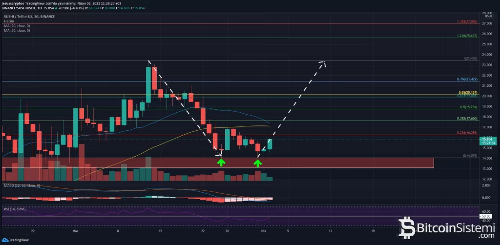 Kripto para piyasasında “Kara Perşembe” olarak anılan 12 – 13 Mart’ın yıl dönümünde %30 artış yaşayarak 23.43 dolarlık ATH seviyesine çıkan SUSHI, bu ATH’den sonra %40 değer kaybına uğradı. Her coinde olduğu gibi ATH seviyelerinden sonraki çekilmeler ve fiyatın belli bir dip seviyesindeki yatay konsalidasyonu artık normal olarak karşılanıyor. Şimdilik trend anlamında önemli olan MA20 (17.365 Dolar) ve MA50 (17.122 Dolar) seviyelerinin altında bulunan SUSHI, önemli bir destek alanı olarak gösterilen 13.08 – 14.08 dolar aralığından gelen alış tepkisiyle yükseliyor.