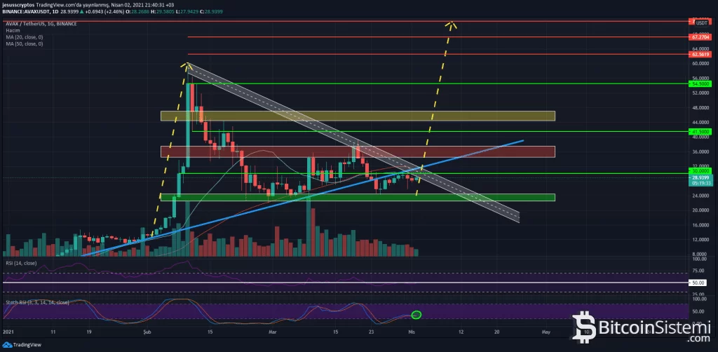 Son ATH seviyesinden gelen düşüş trendine yaklaşan AVAX, yatay ara direnç seviyesi olan 30 doları aşmaya çalışıyor. Fiyatın 30 doları aşmasıyla düşen trendi kırarak yükselmesi beklenirken bu yükseliş sırasında mavi trend çizgisinin direnç göstereceği belirtiliyor.
